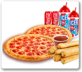 2 pizzas de pepperoni, 2 refrescos, 2 ICEE y garlics breads.