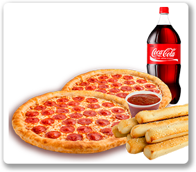 2 pizzas de pepperoni, refresco de 2 lts, garlics breads y tomate sauce.