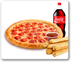 Pizza de pepperoni, refresco de 2 lts, garlics breads y tomate sauce.