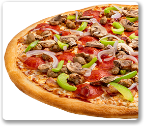 Pizza de pepperoni, cebolla, champiñones, pimiento verde, salchicha italiana y tocino.